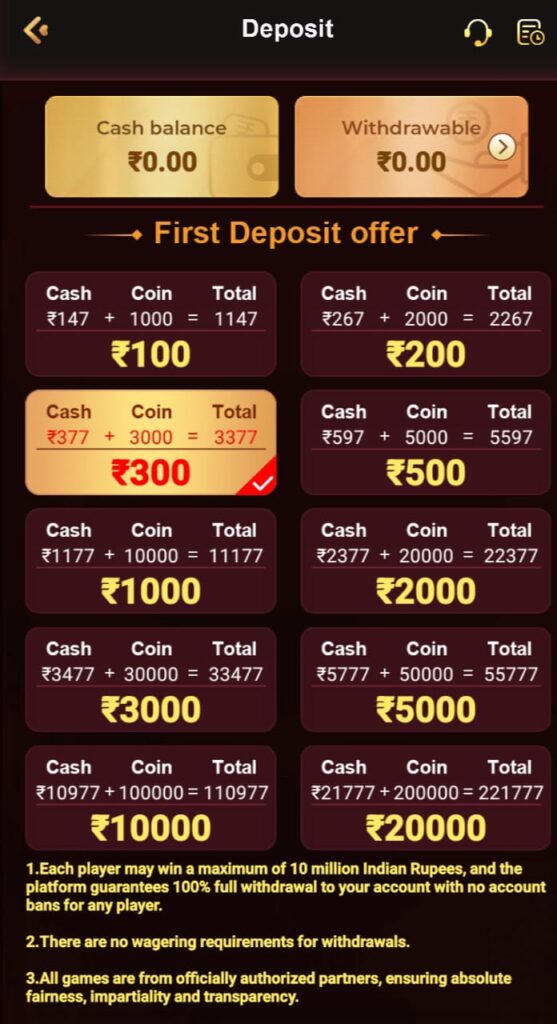 - Minimums: Most apps have a minimum deposit (usually ₹100 for First Games and ₹300 for 1Win).